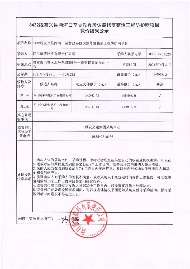 四川康藏路橋有限責(zé)任公司S432線寶興縣兩河口至甘孜界段災(zāi)毀修復(fù)整治工程防護(hù)網(wǎng)項目競價結(jié)果公示