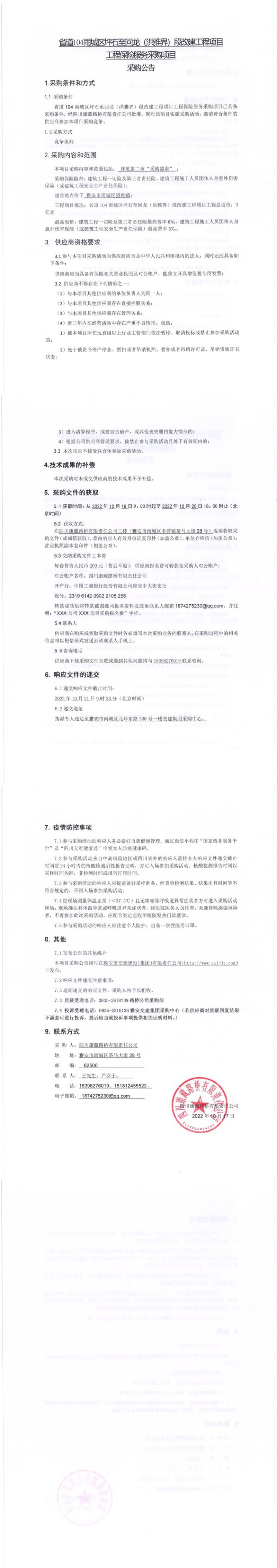 四川康藏路橋有限責(zé)任公司省道104雨城區(qū)坪石至回龍(洪雅界)段改建工程項(xiàng)目工程保險(xiǎn)服務(wù)采購(gòu)項(xiàng)目采購(gòu)公告