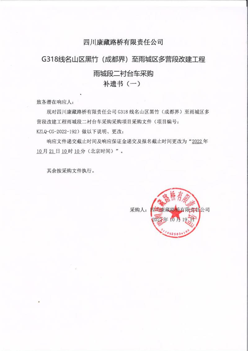 四川康藏路橋有限責(zé)任公司G318線名山區(qū)黑竹(成都界)至雨城區(qū)多營段改建工程雨城段二襯臺車采購補遺書(一)