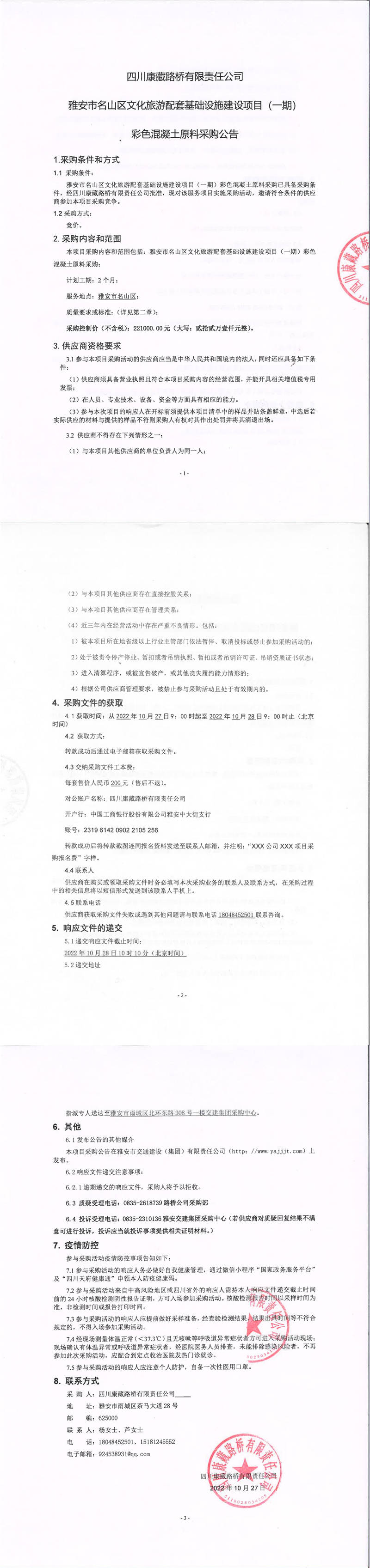 四川康藏路橋有限責任公司雅安市名山區(qū)文化旅游配套基礎設施建設項目(一期)彩色混凝土原料采購公告