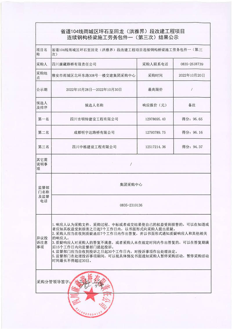 四川康藏路橋有限責任公司省道104線雨城區(qū)坪石至回龍(洪雅界)段改建工程項目連續(xù)鋼構(gòu)橋梁施工勞務包件一(第三次)結(jié)果公示