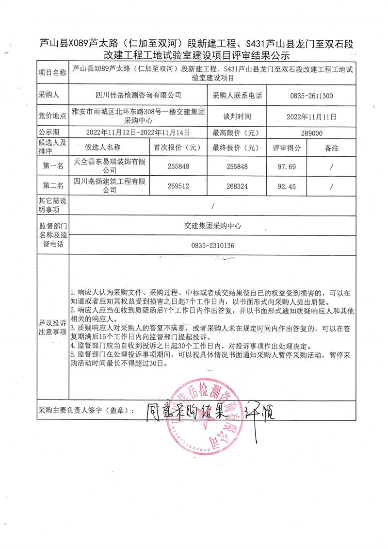 四川佳岳檢測(cè)咨詢有限公司蘆山縣X089蘆太路(仁加至雙河)段新建工程、S431蘆山縣龍門至雙石段改建工程工地試驗(yàn)室建設(shè)項(xiàng)目評(píng)審結(jié)果公示
