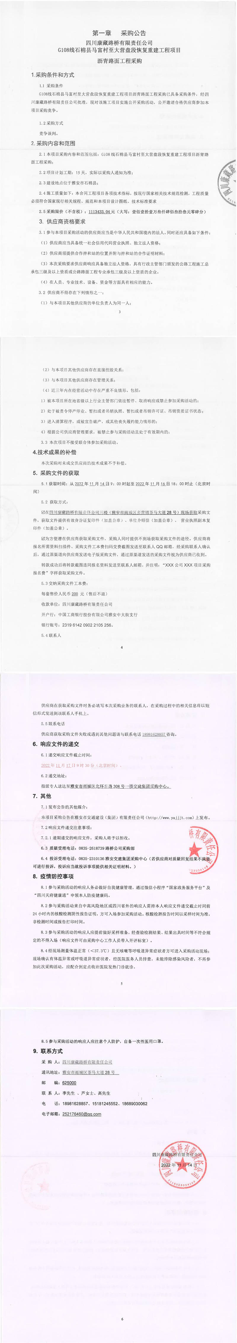 四川康藏路橋有限責(zé)任公司G108線石棉縣馬富村至大營盤段恢復(fù)重建工程項目瀝青路面工程采購公告