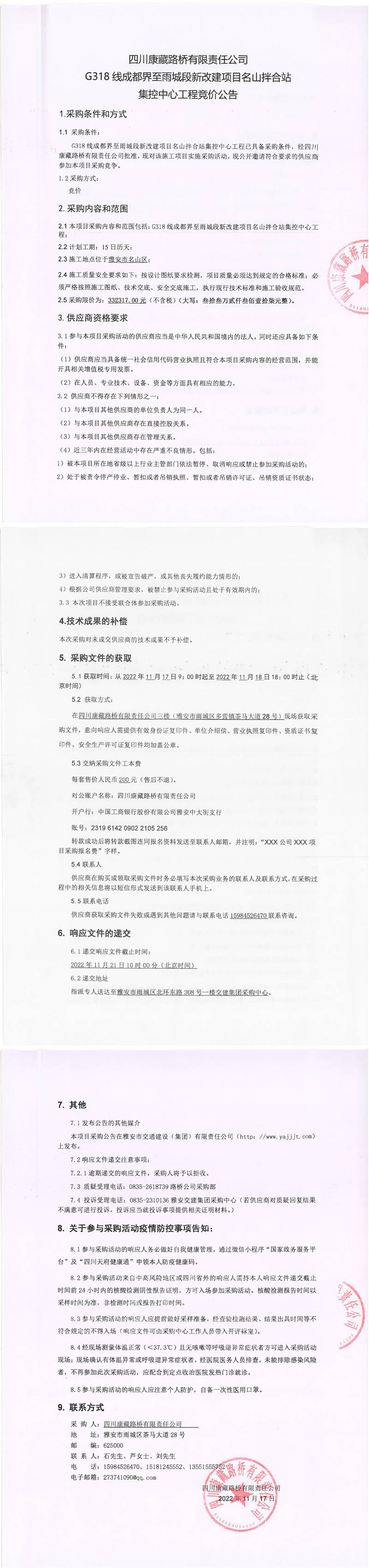 四川康藏路橋有限責(zé)任公司G318線成都界至雨城段新改建項(xiàng)目名山拌合站集控中心工程競價公告