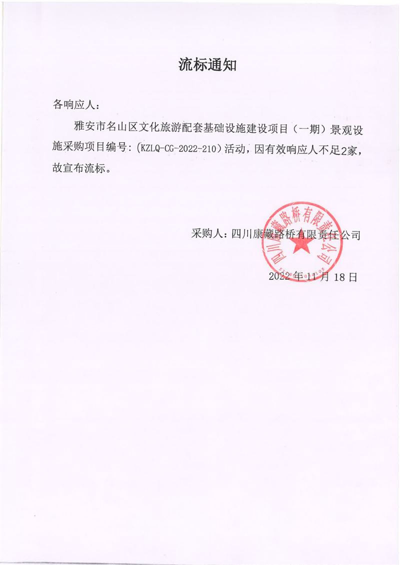 四川康藏路橋有限責任公司雅安市名山區(qū)文化旅游配套基礎(chǔ)設(shè)施建設(shè)項目(一期)景觀設(shè)施采購項目流標通知