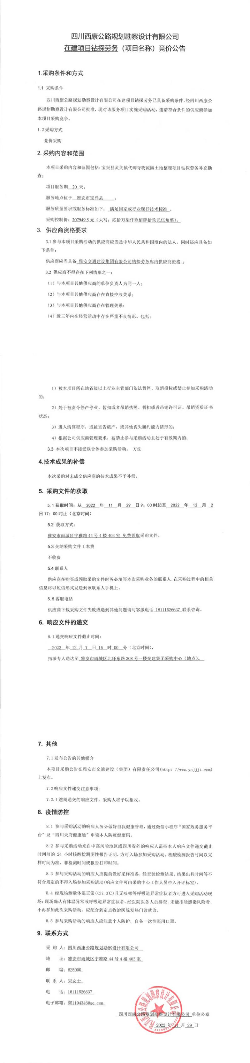 四川西康公路規(guī)劃勘察設(shè)計有限公司在建項目鉆探勞務(wù)競價公告