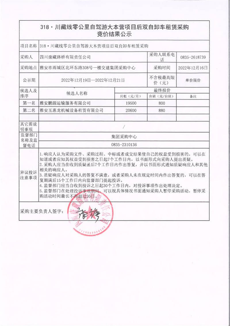 四川康藏路橋有限責任公司318·川藏線零公里自駕游大本營項目后雙自卸車租賃采購競價結(jié)果公示