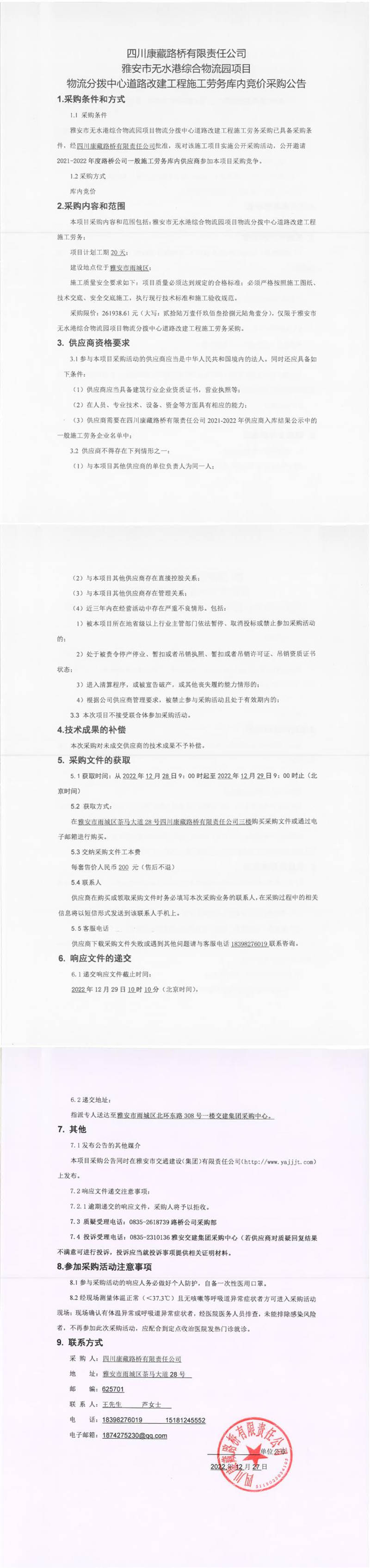 四川康藏路橋有限責(zé)任公司雅安市無水港綜合物流園項(xiàng)目物流分撥中心道路改建工程施工勞務(wù)庫內(nèi)競價采購公告