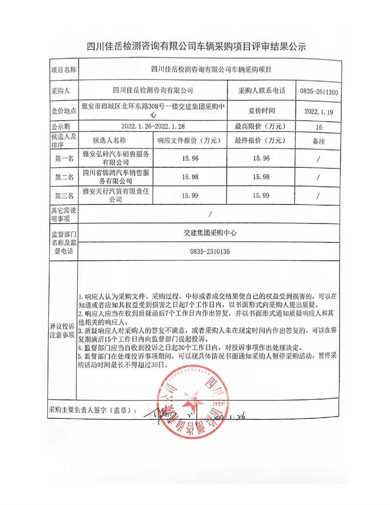 四川佳岳檢測(cè)咨詢(xún)有限公司車(chē)輛采購(gòu)項(xiàng)目評(píng)審結(jié)果公示