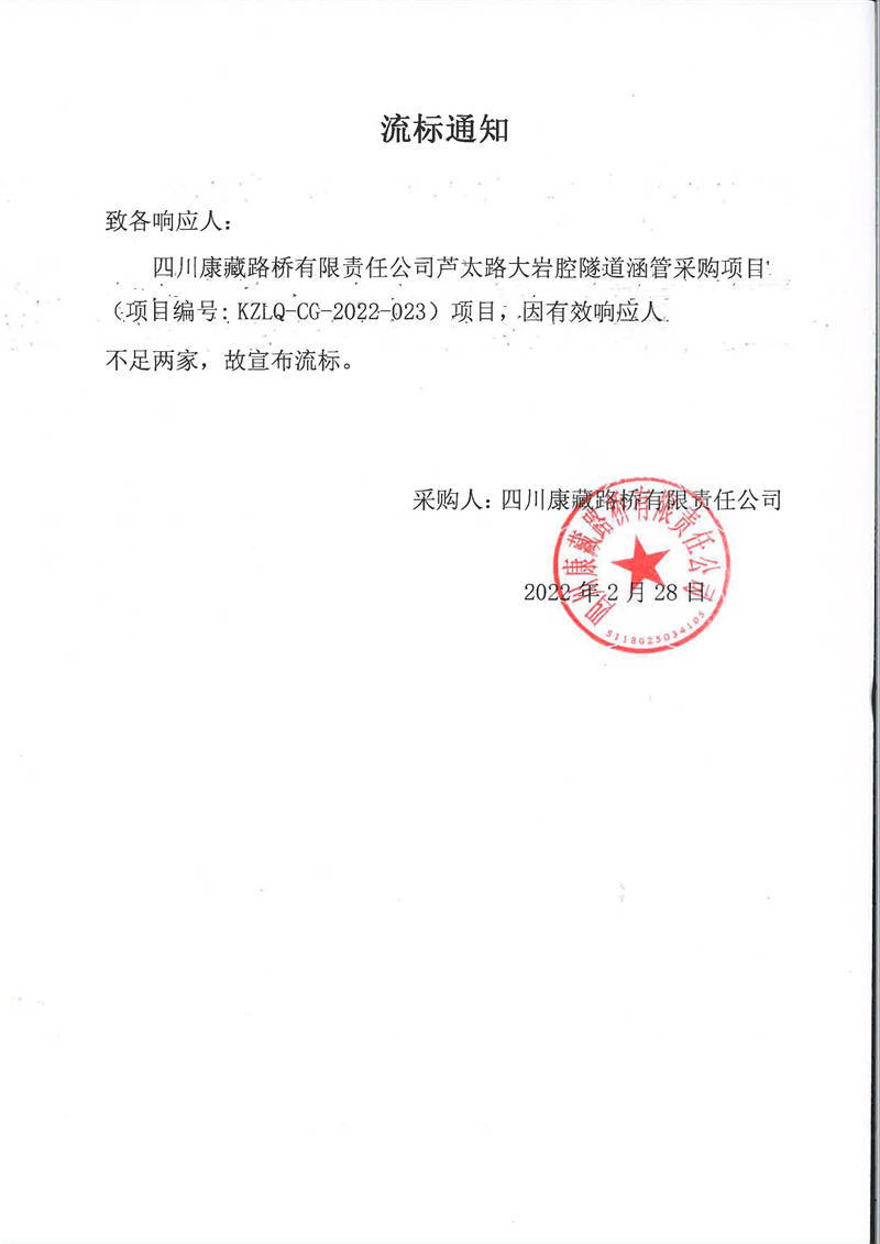 四川康藏路橋有限責任公司蘆太路大巖腔隧道涵管采購項目流標通知