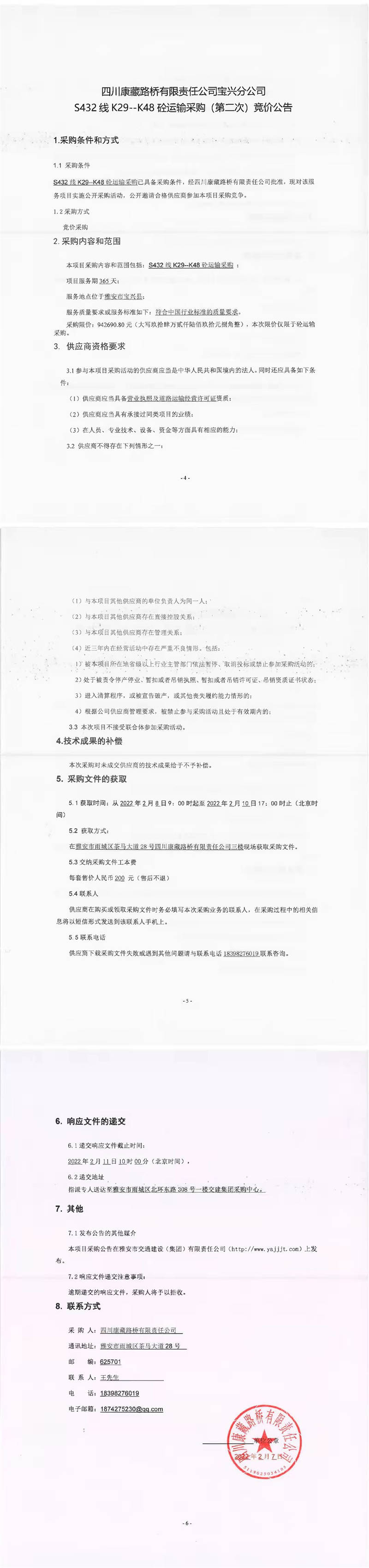 四川康藏路橋有限責(zé)任公司寶興分公司S432線K29-K48砼運輸采購(第二次)競價公告