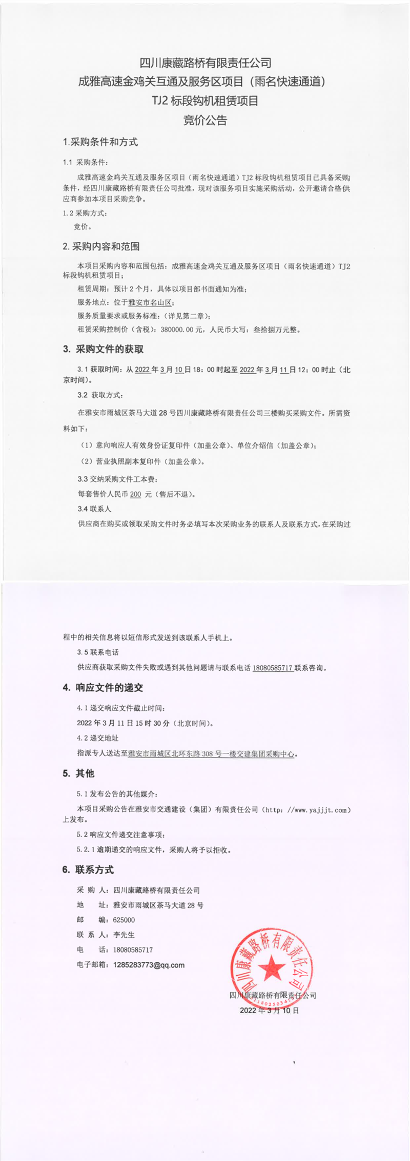四川康藏路橋有限責任公司成雅高速金雞關(guān)互通及服務(wù)區(qū)項目(雨名快速通道)TJ2標段鉤機租賃項目競價公告