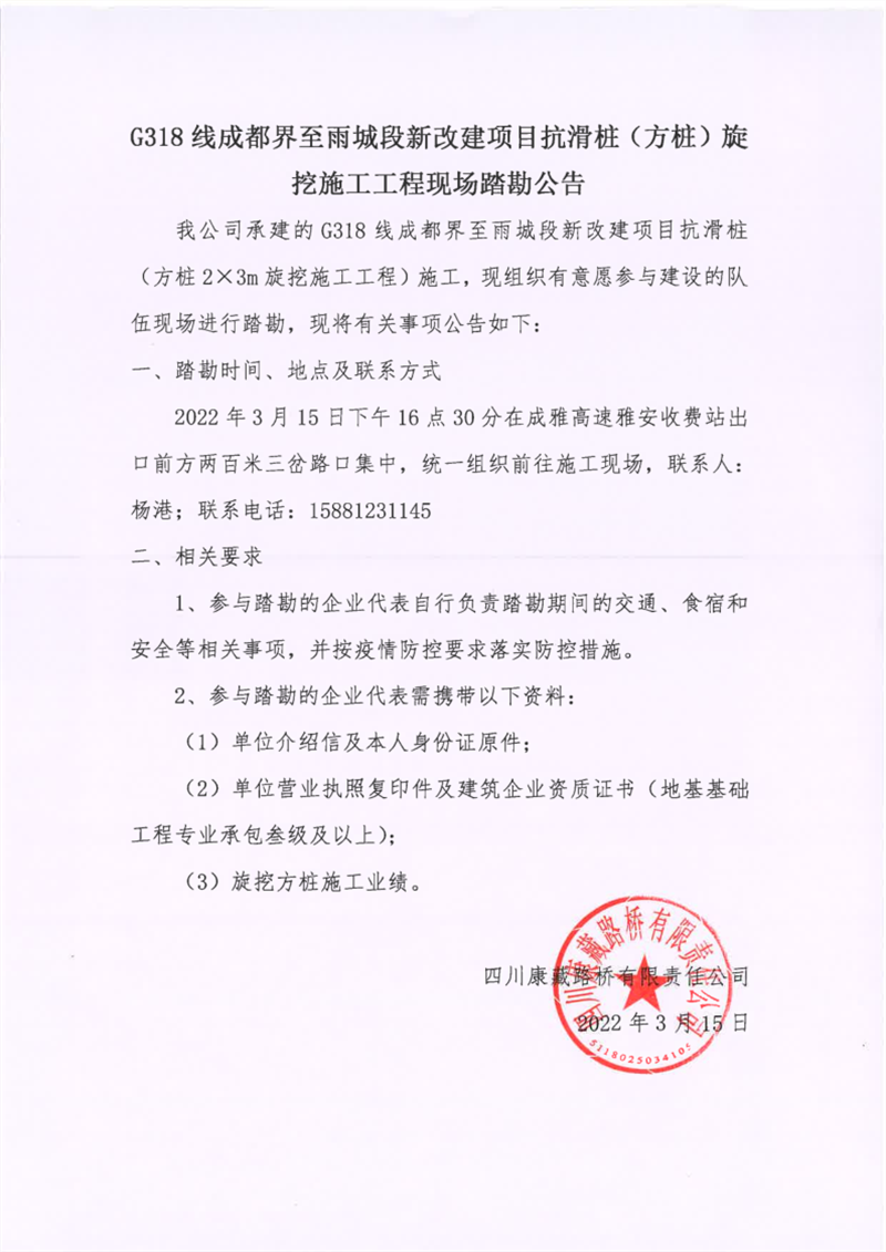 四川康藏路橋有限責任公司G318線成都界至雨城段新改建項目抗滑樁(方樁)旋挖施工工程現(xiàn)場踏勘公告