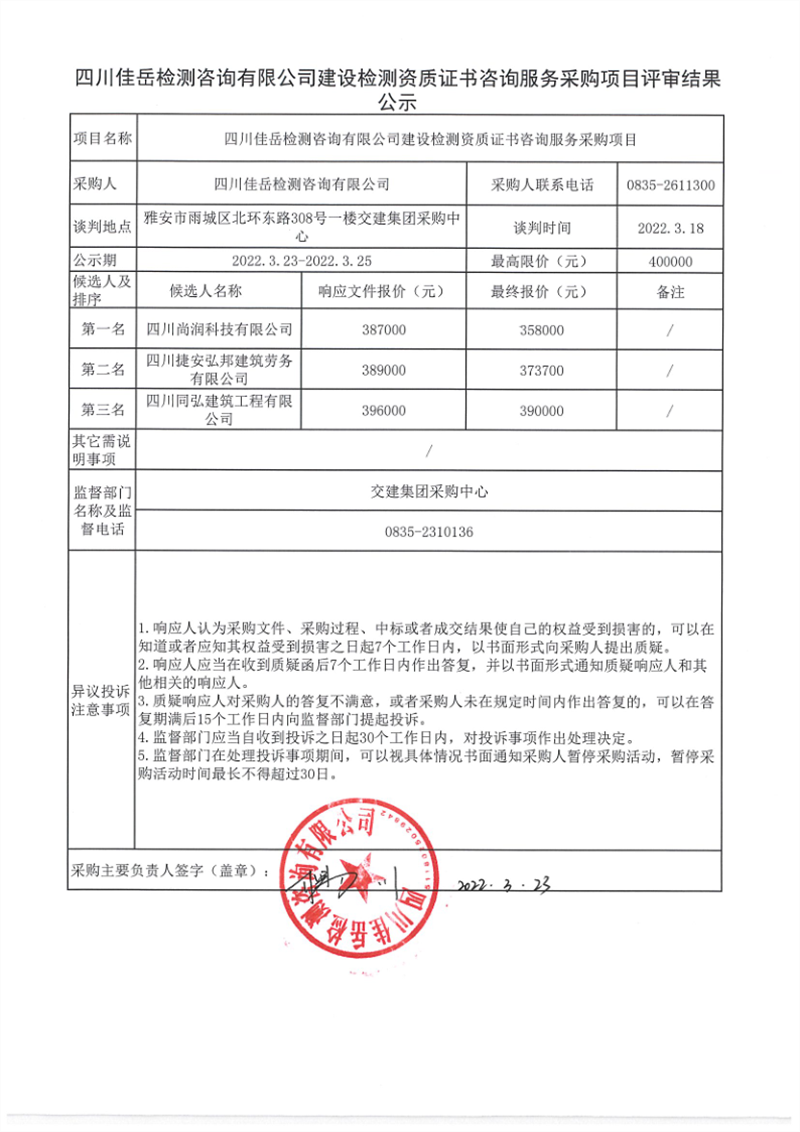 四川佳岳檢測(cè)咨詢有限公司建設(shè)檢測(cè)資質(zhì)證書(shū)咨詢服務(wù)采購(gòu)項(xiàng)目評(píng)審結(jié)果公示