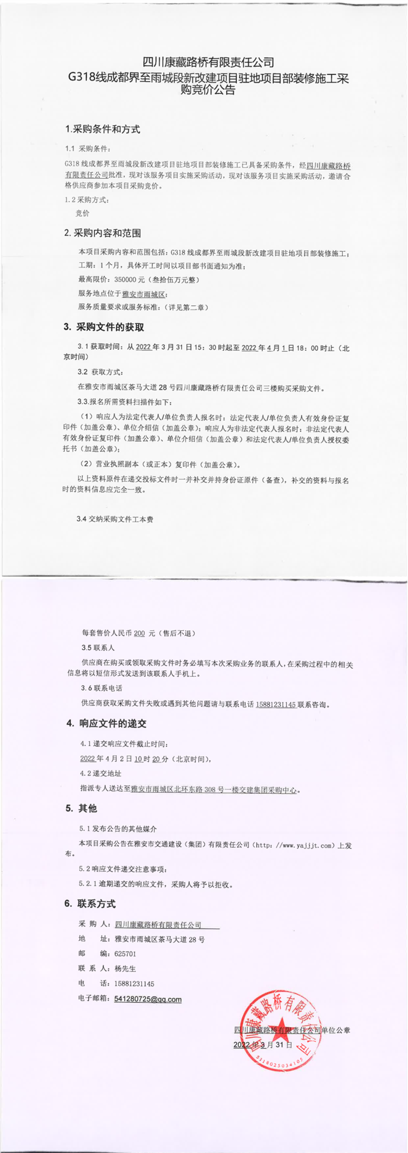 四川康藏路橋有限責(zé)任公司G318線成都界至雨城段新改建項(xiàng)目駐地項(xiàng)目部裝修施工采購競價(jià)公告