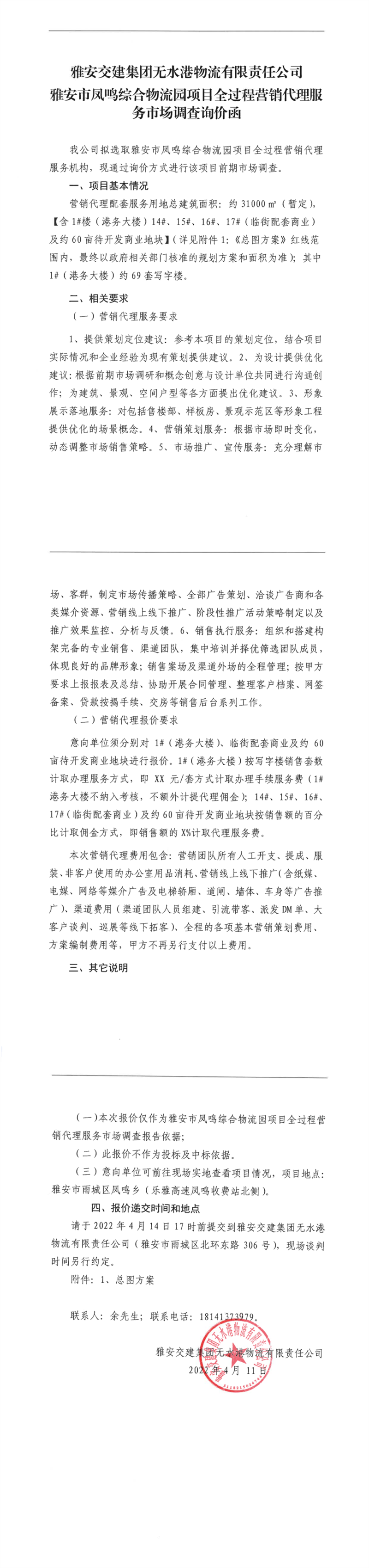 雅安交建集團(tuán)無(wú)水港物流有限責(zé)任公司雅安市鳳鳴綜合物流園項(xiàng)目全過(guò)程營(yíng)銷(xiāo)代理服務(wù)市場(chǎng)調(diào)查詢價(jià)函