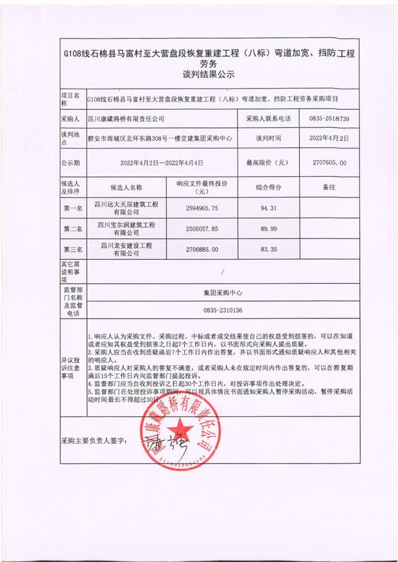 四川康藏路橋有限責(zé)任公司G108線石棉縣馬富村至大營盤段恢復(fù)重建工程(八標(biāo))彎道加寬、擋防工程勞務(wù)談判結(jié)果公示