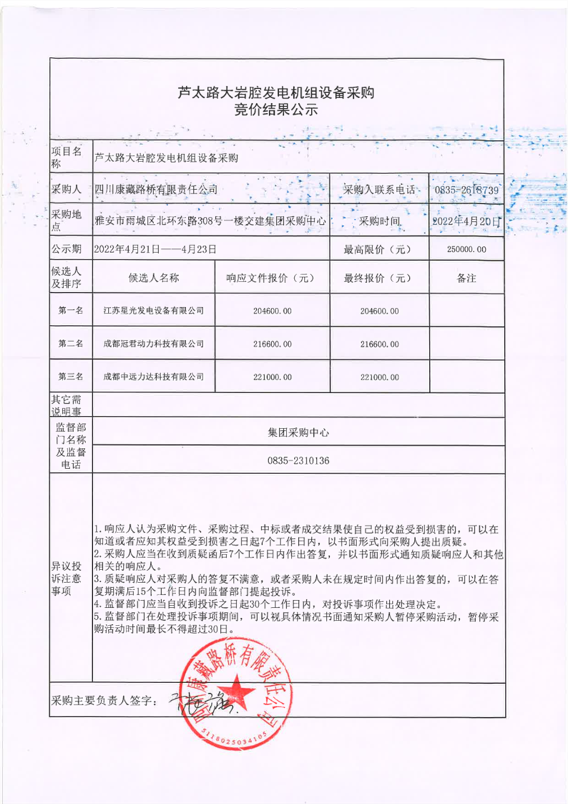 四川康藏路橋有限責任公司蘆太路大巖腔發(fā)電機組設備采購競價結果公示