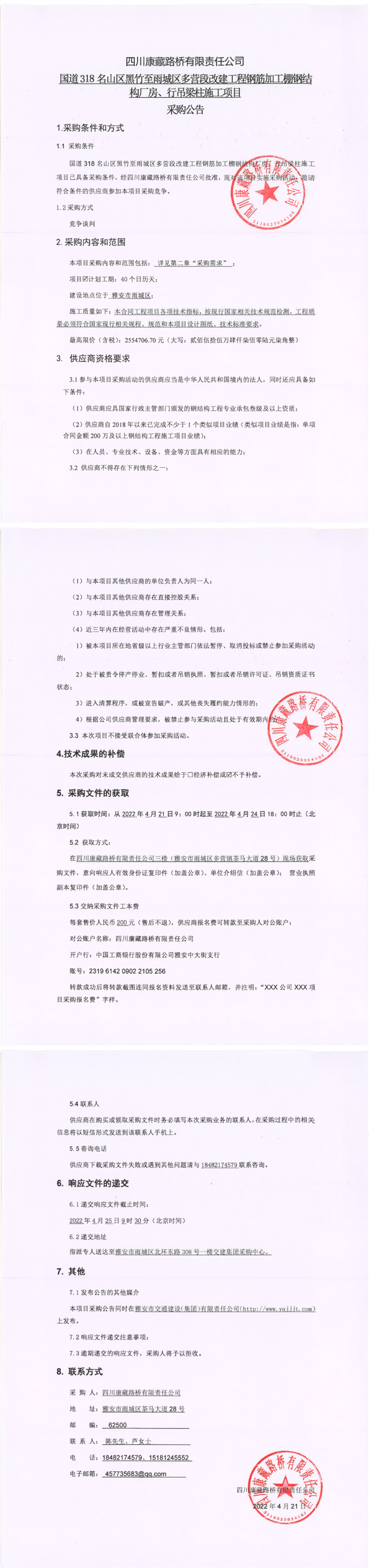 四川康藏路橋有限責(zé)任公司國道318名山區(qū)黑竹(成都界)至雨城區(qū)多營段改建工程名山段鋼結(jié)構(gòu)鋼筋加工棚工程談判結(jié)果公示
