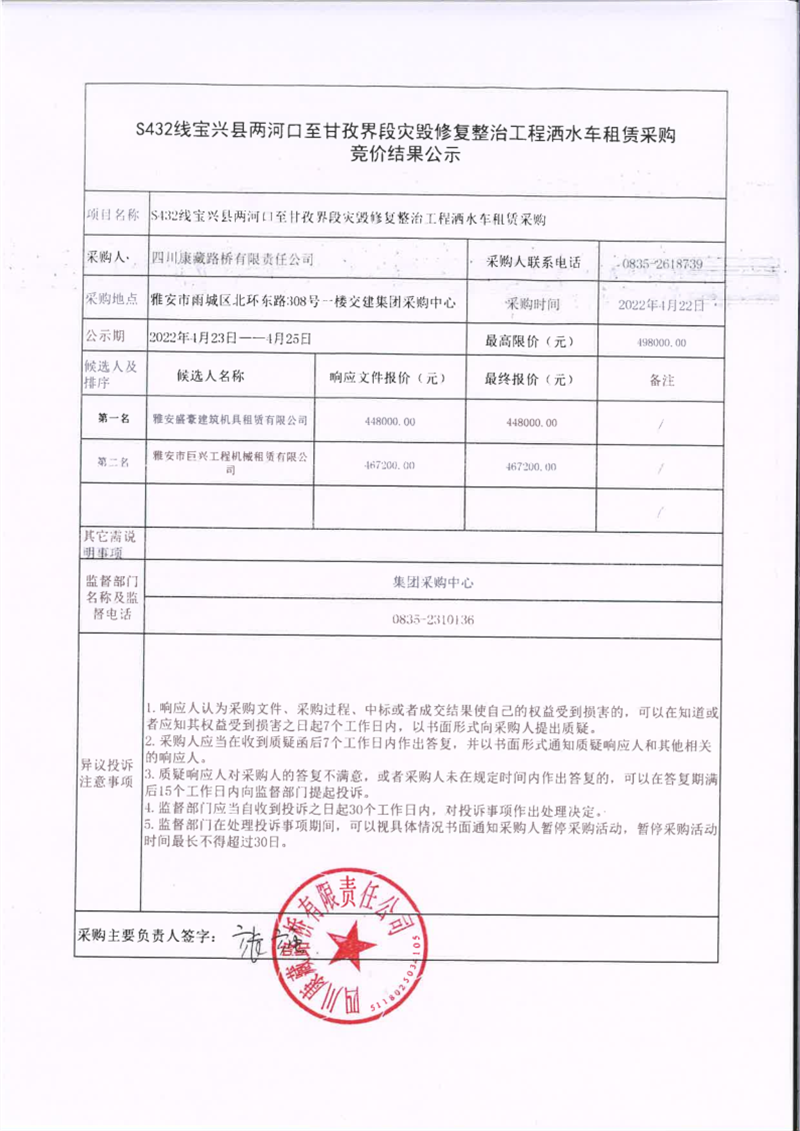 四川康藏路橋有限責任公司S432線寶興縣兩河口至甘孜界段災毀修復整治工程灑水車租賃采購競價結(jié)果公示
