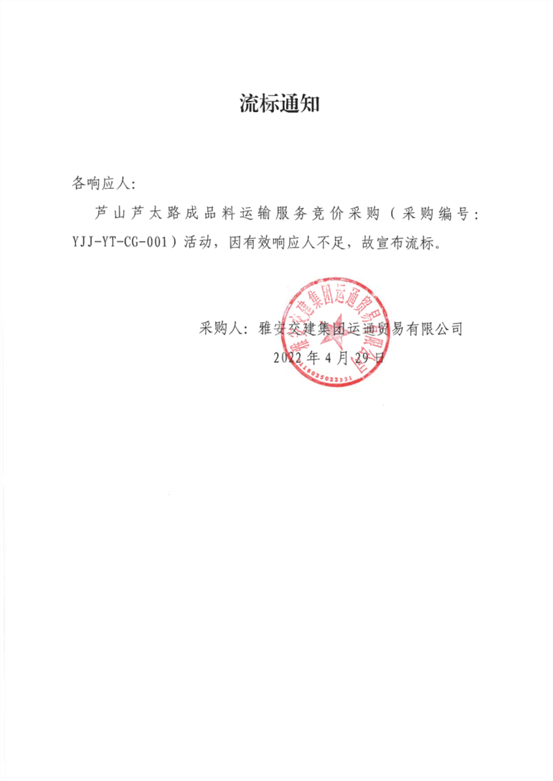 雅安交建集團運通貿易有限公司蘆山蘆太路成品料運輸服務競價采購流標通知