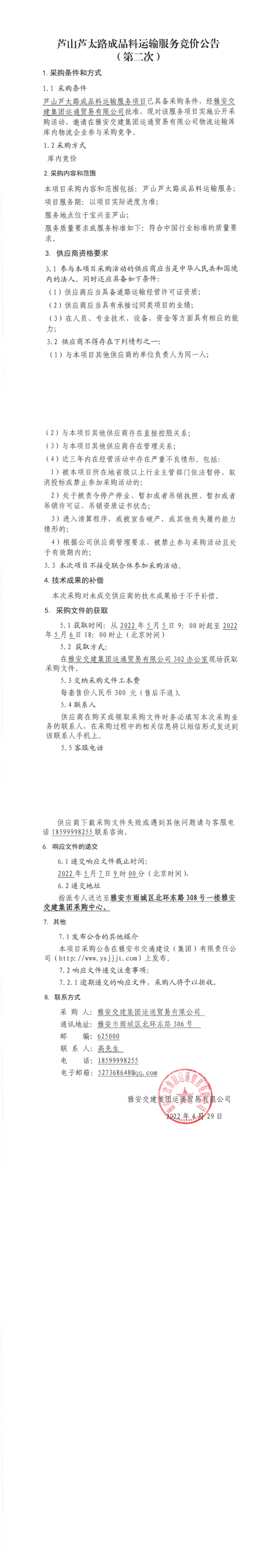 雅安交建集團運通貿(mào)易有限公司蘆山蘆太路成品料運輸服務(wù)競價公告(第二次)
