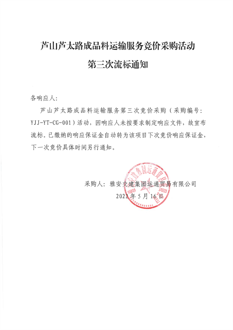 雅安交建集團運通貿(mào)易有限公司蘆山蘆太路成品料運輸服務(wù)競價采購活動第三次流標通知