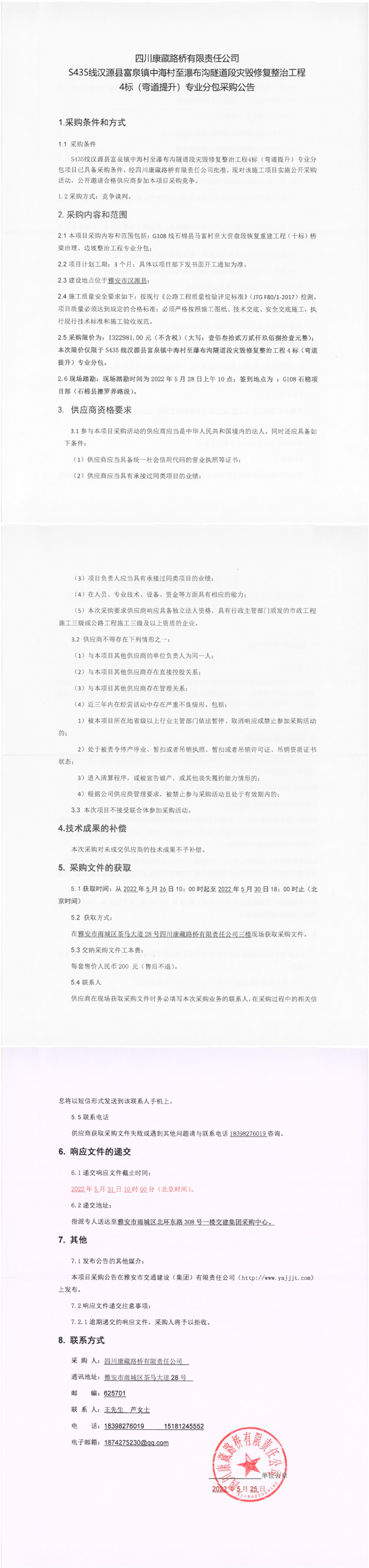 四川康藏路橋有限責任公司S435線漢源縣富泉鎮(zhèn)中海村至瀑布溝隧道段災(zāi)毀修復整治工程4標(彎道提升)專業(yè)分包采購公告