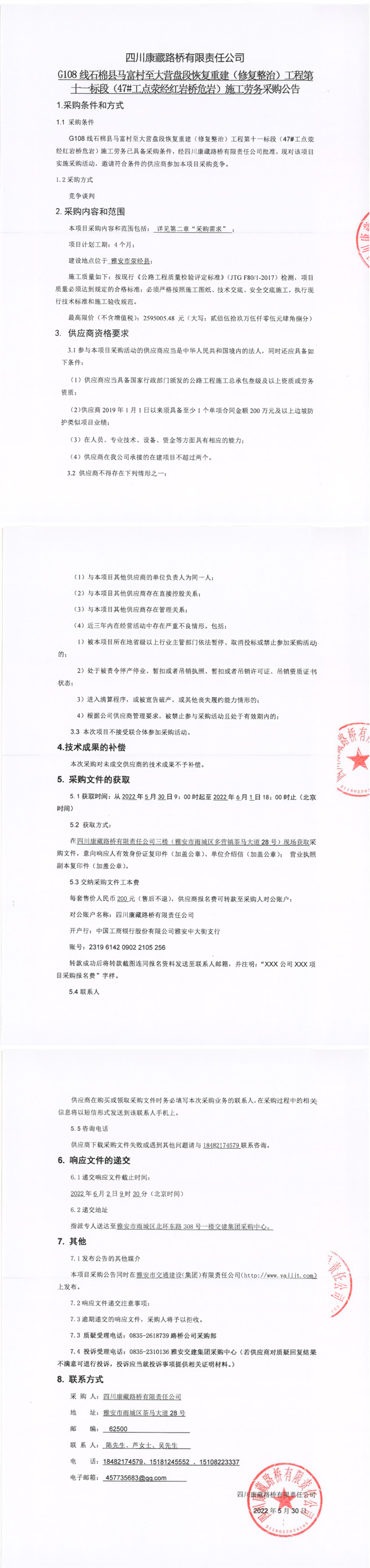 四川康藏路橋有限責任公司G108線石棉縣馬富村至大營盤段恢復(fù)重建(修復(fù)整治)工程第十一標段(47#工點滎經(jīng)紅巖橋危巖)施工勞務(wù)采購公告