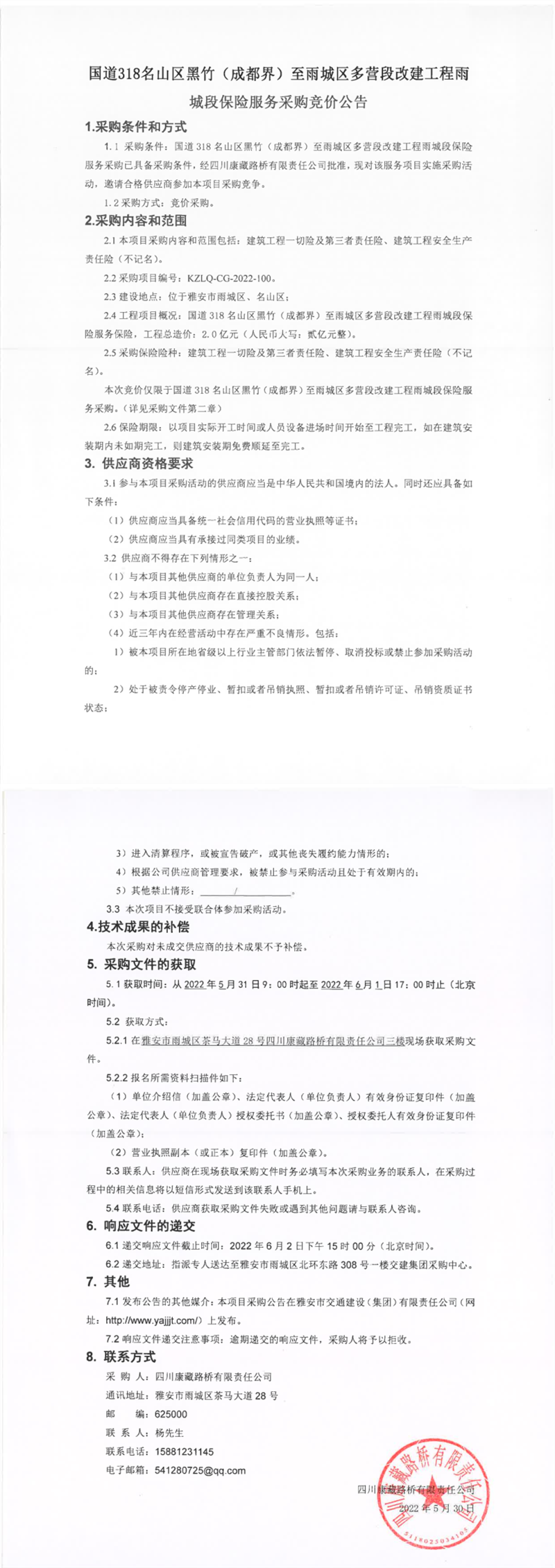 四川康藏路橋有限責(zé)任公司國道318名山區(qū)黑竹(成都界)至雨城區(qū)多營段改建工程雨城段保險服務(wù)采購競價公告
