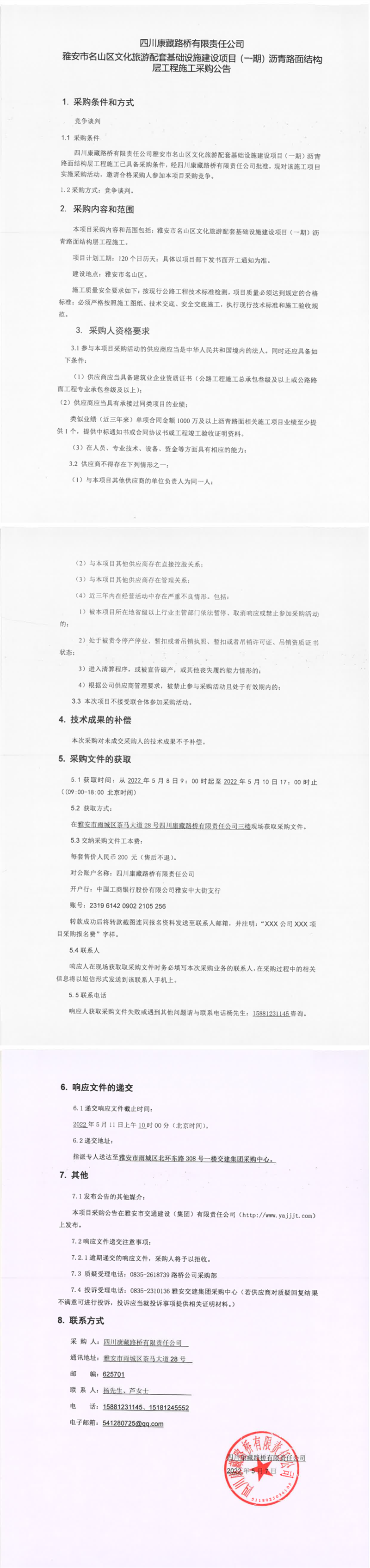 四川康藏路橋有限責(zé)任公司雅安市名山區(qū)文化旅游配套基礎(chǔ)設(shè)施建設(shè)項(xiàng)目(一期)瀝青路面結(jié)構(gòu)層工程施工采購公告