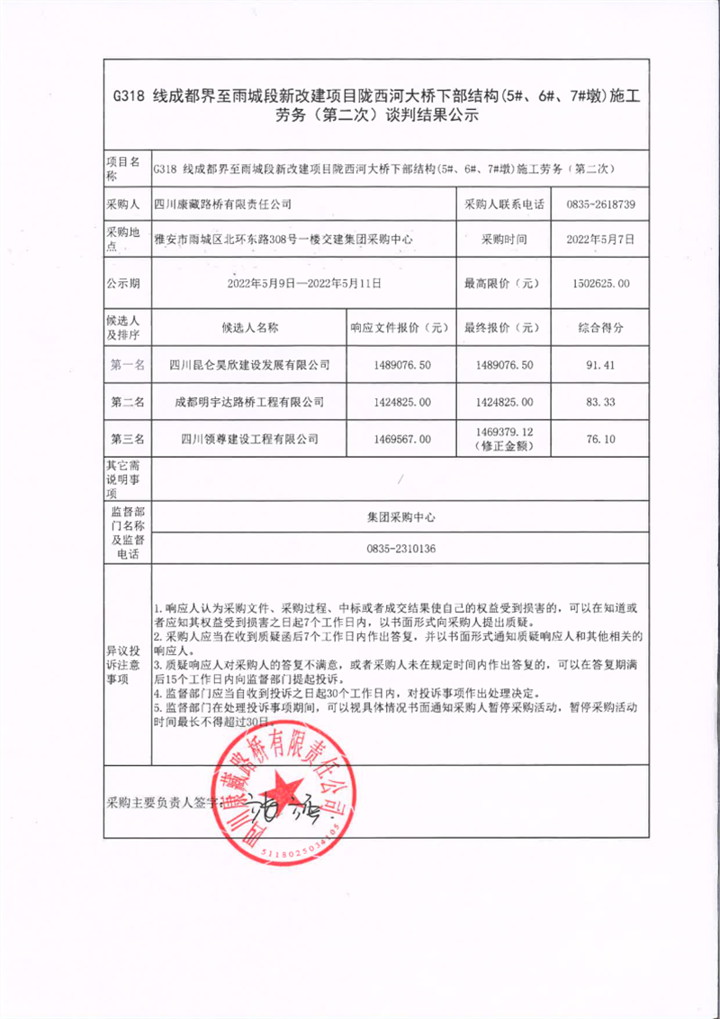 四川康藏路橋有限責任公司G318線成都界至雨城段新改建項目隴西河大橋下部結構(5#、6#、7#墩)施工勞務(第二次)談判結果公示