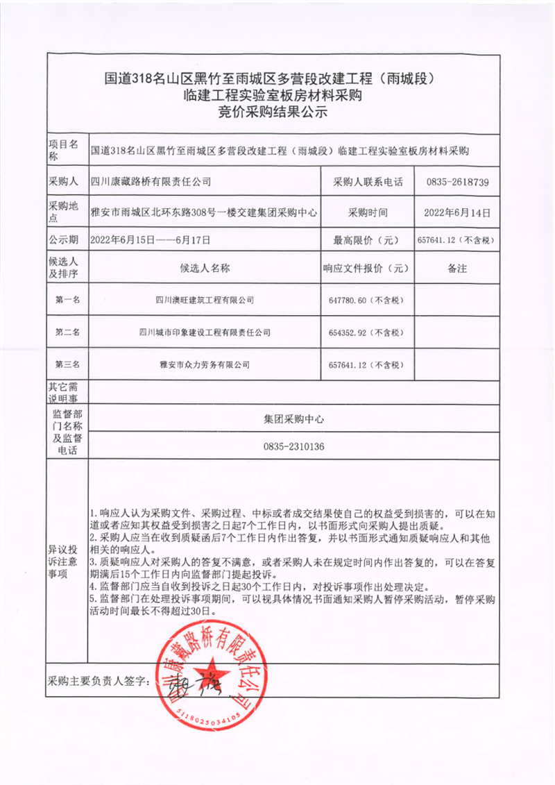 四川康藏路橋有限責任公司國道318名山區(qū)黑竹至雨城區(qū)多營段改建工程(雨城段)臨建工程實驗室板房材料采購競價采購結(jié)果公示