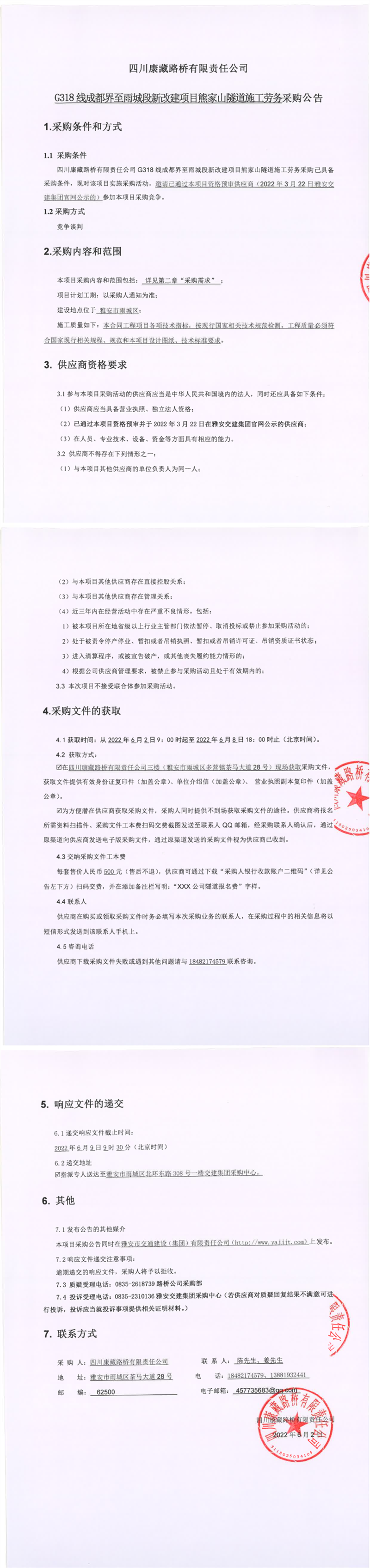 四川康藏路橋有限責(zé)任公司G318線成都界至雨城段新改建項(xiàng)目熊家山隧道施工勞務(wù)采購公告