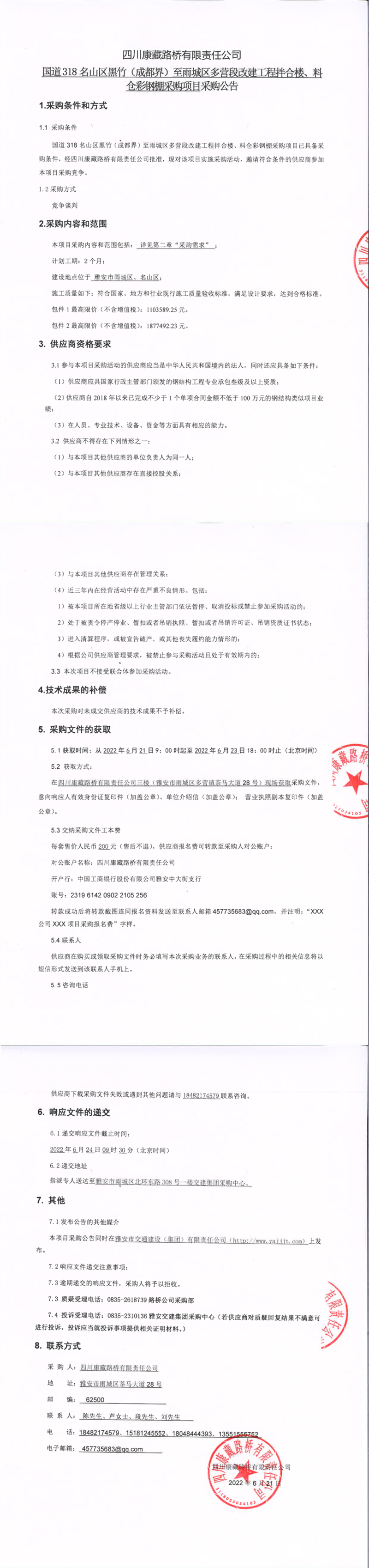四川康藏路橋有限責任公司國道318名山區(qū)黑竹(成都界)至雨城區(qū)多營段改建工程拌合樓、料倉彩鋼棚采購項目采購公告
