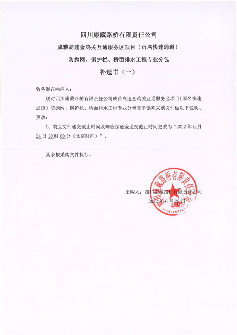 四川康藏路橋有限責(zé)任公司成雅高速金雞關(guān)互通服務(wù)區(qū)項目(雨名快速通道)防拋網(wǎng)、鋼護(hù)欄、橋面排水工程專業(yè)分包補(bǔ)遺書(一)