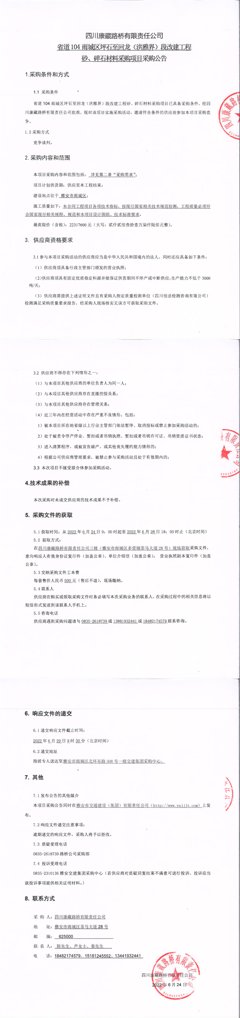 四川康藏路橋有限責(zé)任公司省道104雨城區(qū)坪石至回龍(洪雅界)段改建工程砂、碎石材料采購(gòu)項(xiàng)目采購(gòu)公告