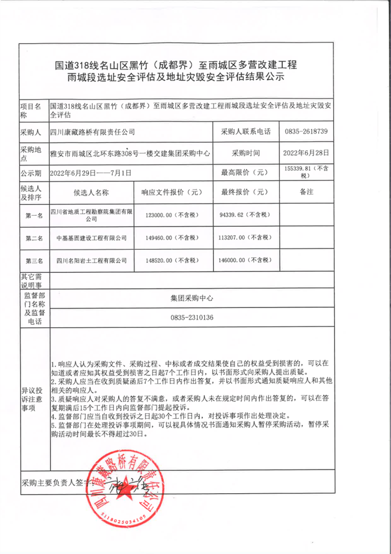 四川康藏路橋有限責(zé)任公司國道318名山區(qū)黑竹(成都界)至雨城區(qū)多營段改建工程雨城段選址安全評估及地址災(zāi)毀安全評估結(jié)果公示