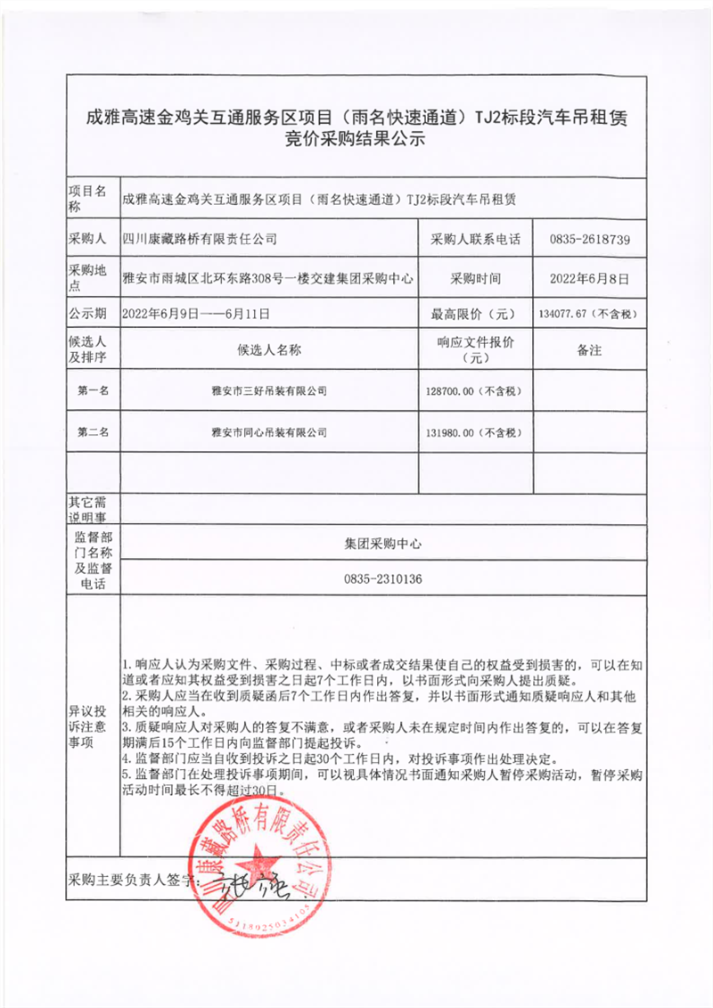 四川康藏路橋有限責(zé)任公司成雅高速金雞關(guān)互通服務(wù)區(qū)項(xiàng)目(雨名快速通道)TJ2標(biāo)段汽車(chē)吊租賃競(jìng)價(jià)采購(gòu)結(jié)果公示
