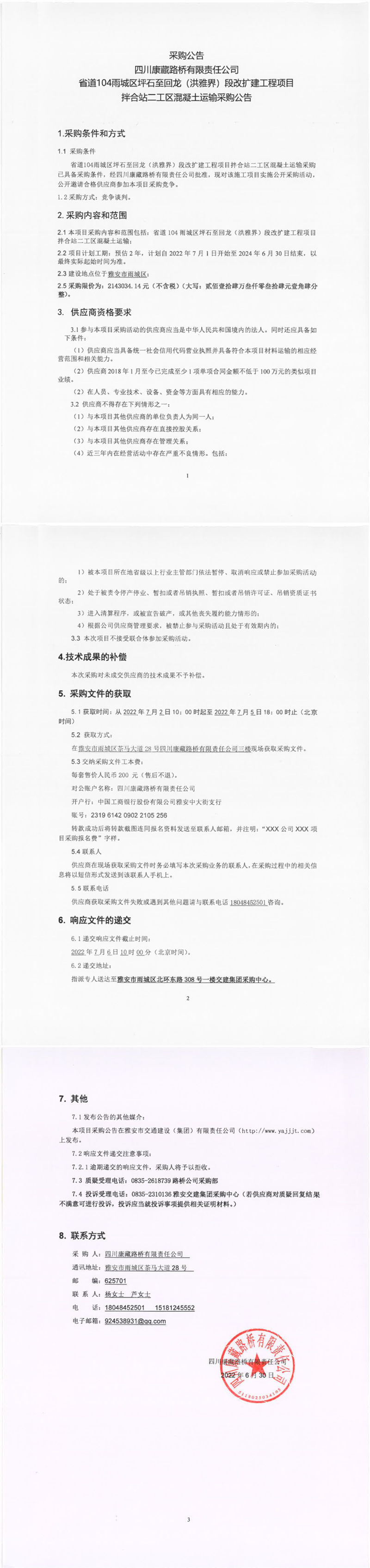 四川康藏路橋有限責任公司省道104雨城區(qū)坪石至回龍(洪雅界)段改擴建工程項目拌合站二工區(qū)混凝土運輸采購公告