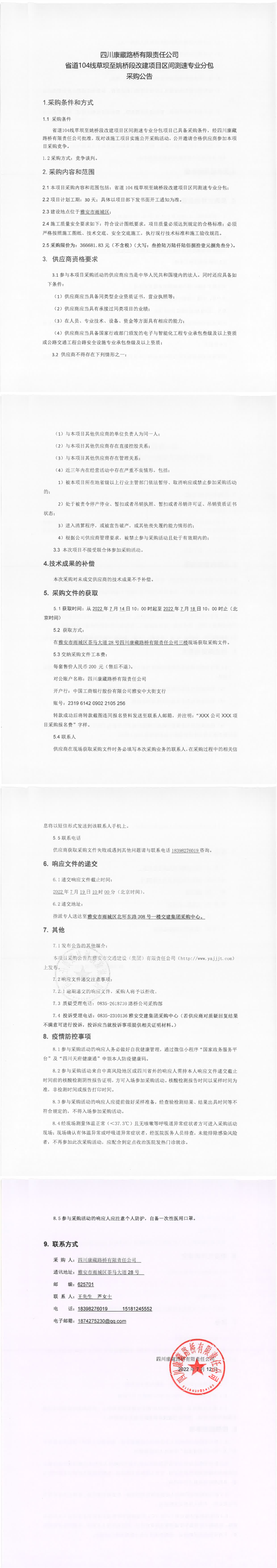 四川康藏路橋有限責(zé)任公司省道104線草壩至姚橋段改建項目區(qū)間測速專業(yè)分包采購公告