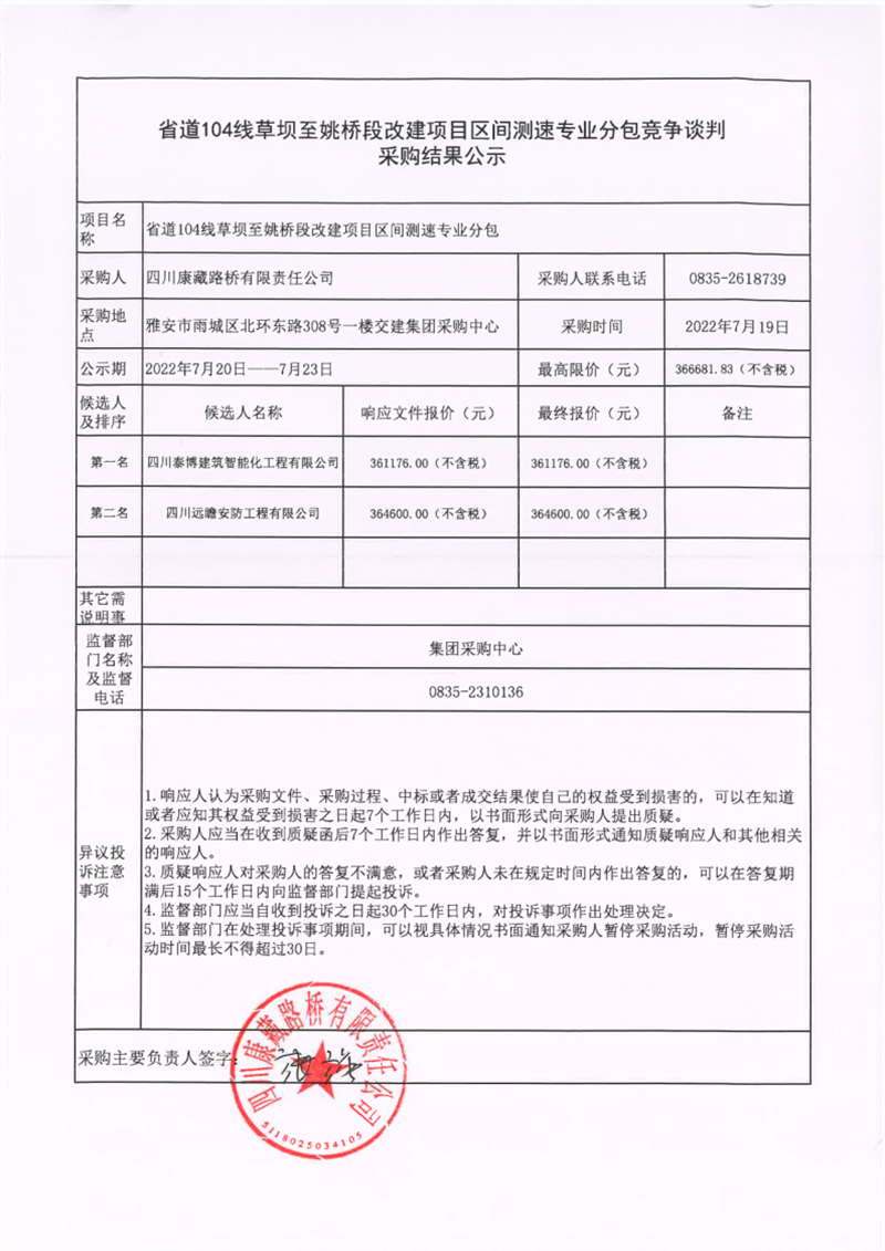 四川康藏路橋有限責(zé)任公司省道104線草壩至姚橋段改建項目區(qū)間測速專業(yè)分包競爭談判采購結(jié)果公示