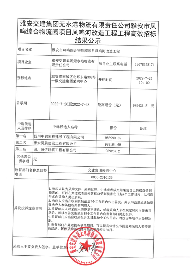 雅安交建集團無水港物流有限責任公司雅安市鳳鳴綜合物流園鳳鳴河改造工程工程高效招標結果公示