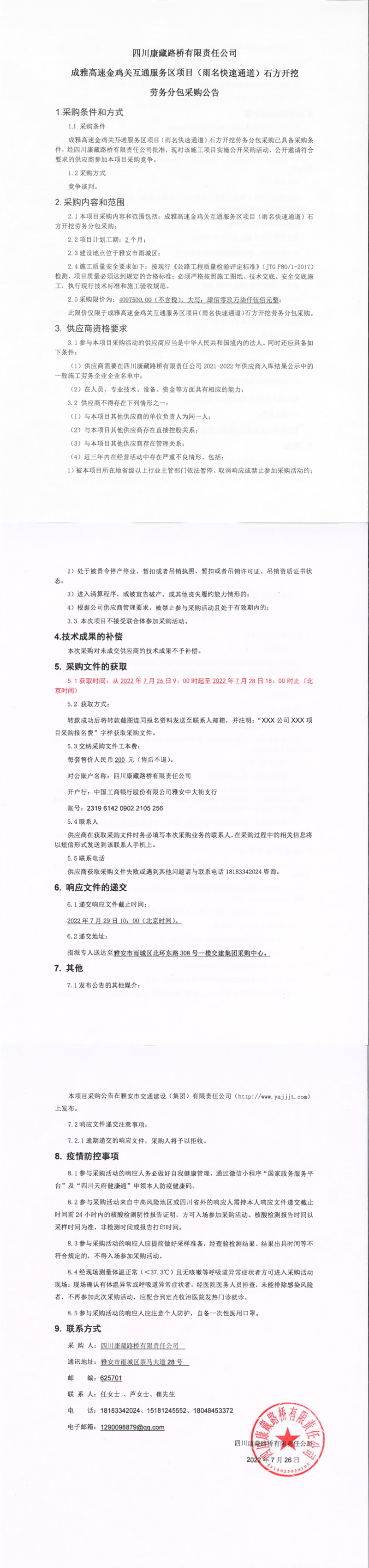 四川康藏路橋有限責(zé)任公司成雅高速金雞關(guān)互通及服務(wù)區(qū)項目(雨名快速通道)石方開挖勞務(wù)分包采購公告