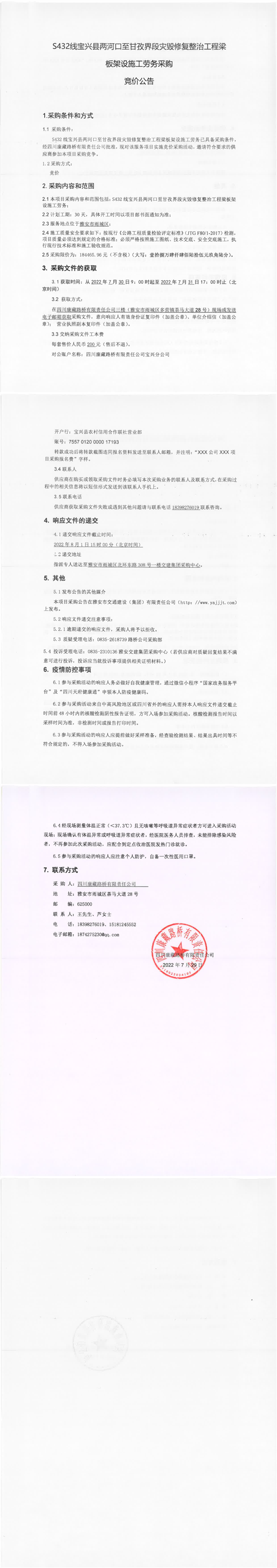 四川康藏路橋有限責任公司S432線寶興縣兩河口至甘孜界段災(zāi)毀修復(fù)整治工程梁板架設(shè)施工勞務(wù)采購競價公告