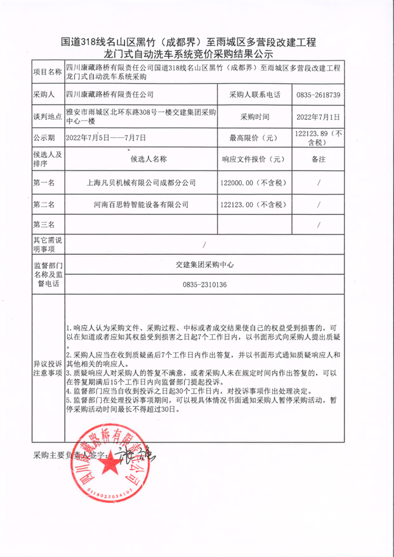四川康藏路橋有限責(zé)任公司國(guó)道318名山區(qū)黑竹(成都界)至雨城區(qū)多營(yíng)段改建工程龍門(mén)式自動(dòng)洗車(chē)系統(tǒng)競(jìng)價(jià)采購(gòu)結(jié)果公示