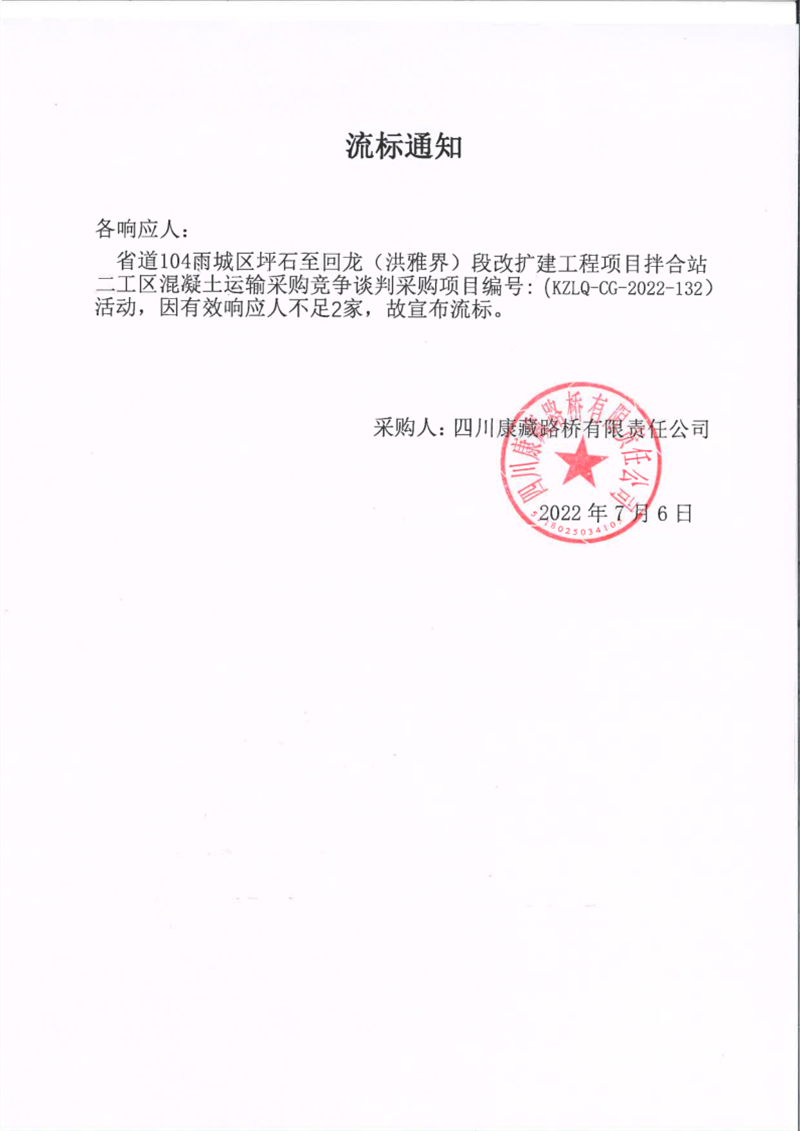 四川康藏路橋有限責(zé)任公司省道104線雨城區(qū)坪石至回龍(洪雅界)段改建工程項(xiàng)目拌合站二工區(qū)混凝土運(yùn)輸采購競(jìng)爭(zhēng)談判采購項(xiàng)目流標(biāo)通知