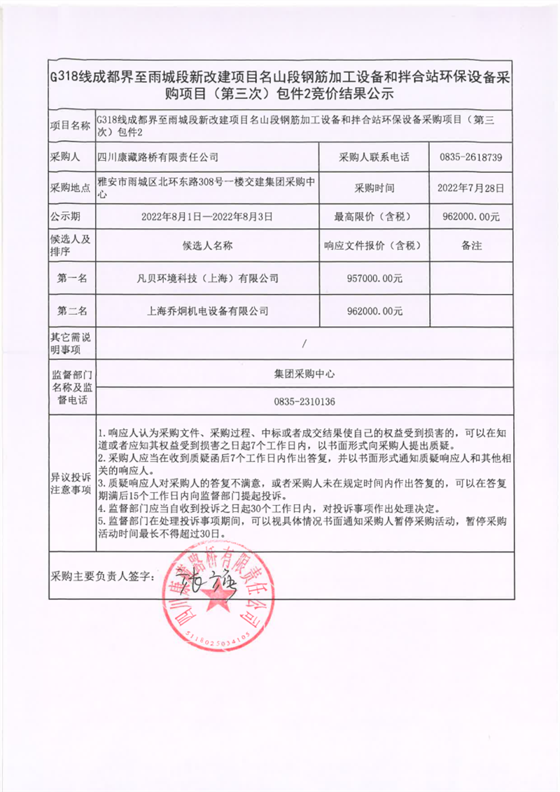 四川康藏路橋有限責(zé)任公司G318線成都界至雨城段新改建項目名山段鋼筋加工設(shè)備和拌合站環(huán)保設(shè)備采購項目(第三次)包件2競價結(jié)果公示