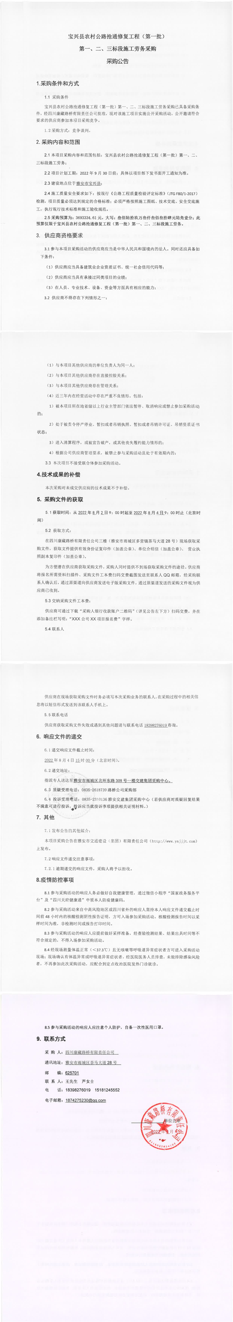 四川康藏路橋有限責(zé)任公司寶興縣農(nóng)村公路搶通修復(fù)工程(第一批)第一、二、三標(biāo)段施工勞務(wù)采購(gòu)采購(gòu)公告