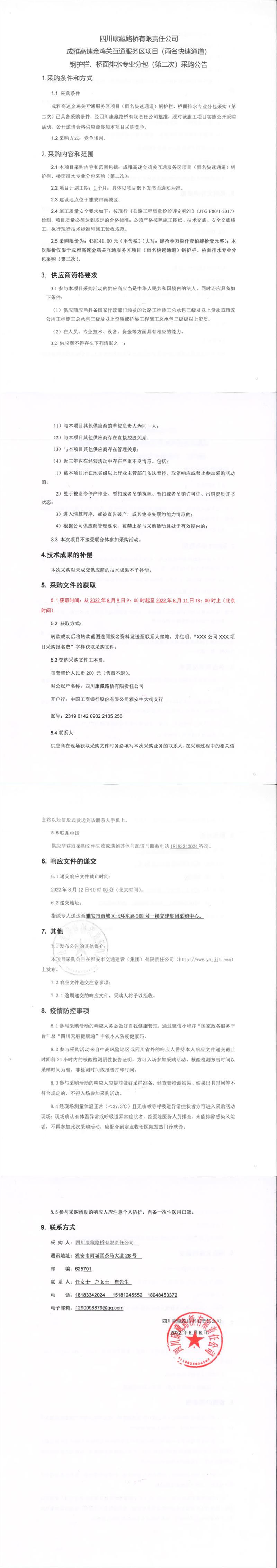 四川康藏路橋有限責任公司成雅高速金雞關(guān)互通服務區(qū)項目(雨名快速通道)鋼護欄、橋面排水工程專業(yè)分包(第二次)采購公告